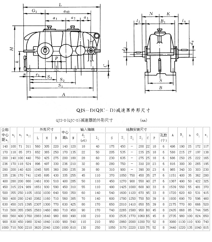 1)結構型式  QJ-D型減速器分為:QJR-D(QJB-D)型為二級,QJS-D(QJC-D)型為三級。QJRS-D(QJD-D)型為二級安裝尺寸三級速比。