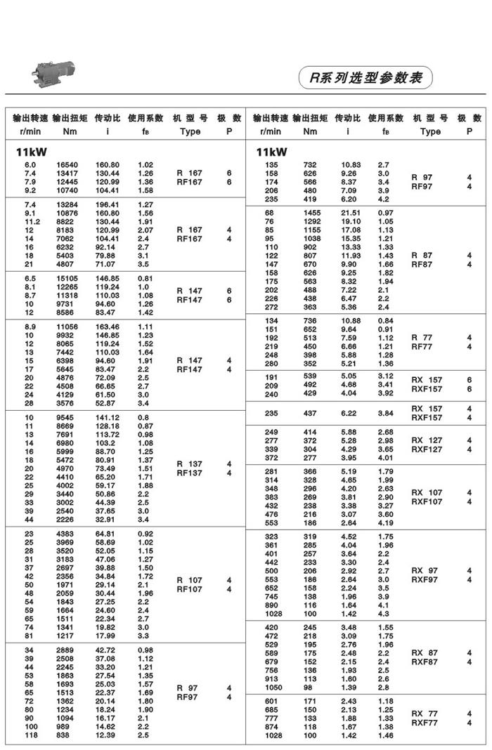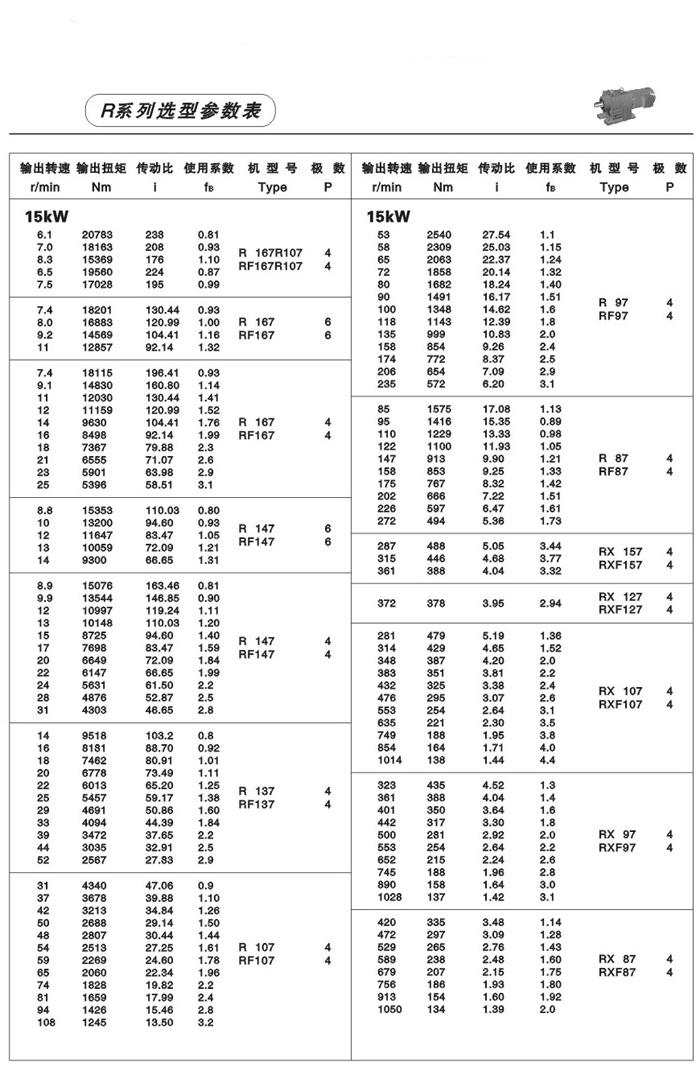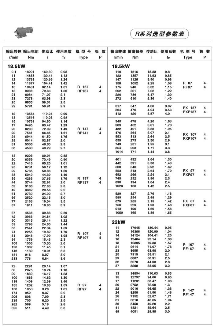 性能、特點: R系列斜齒輪減速機,結合國際技術要求制造,具有很高的科技含量,節省空間,可靠耐用,承受過載能b高,功率可達132Kw,能耗低,性能優越,減速機效率高達95%以上,振動小,噪音低,節能高,選用優質鍛鋼材料,鋼性鑄鐵箱體,齒輪表面經過滲碳淬火,經過精密加工,確保軸平衡度和定位軸承要求,形成齒輪轉動總成的減速機,配合各類電機組成機電一體化,完全保證了產品的質量。